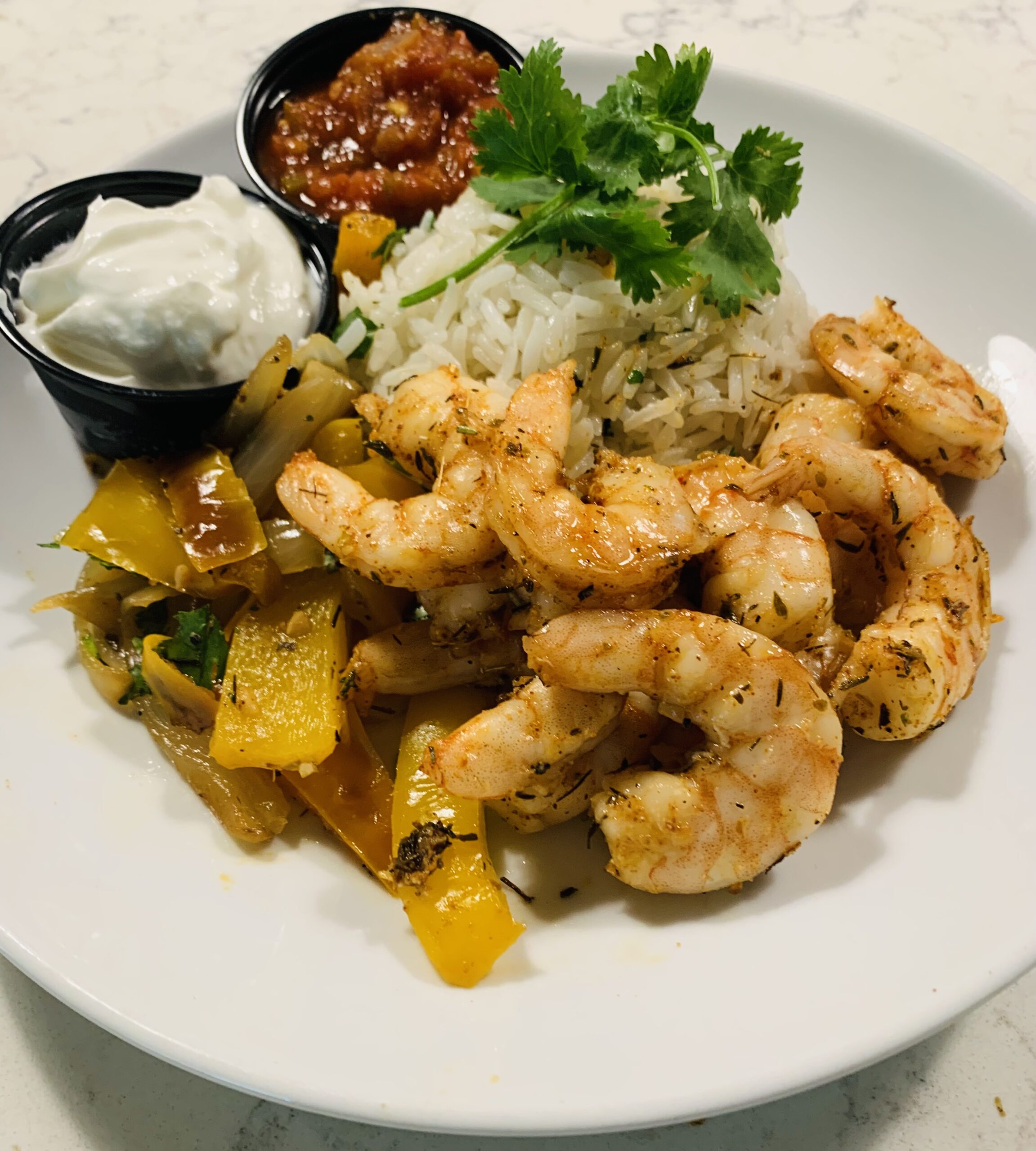 6oz of blackened Shrimp served over fragrant cilantro-lime rice, complemented by cooling Greek yogurt, fresh salsa, and sweet caramelized peppers and onions for a vibrant, flavorful, and balanced meal.