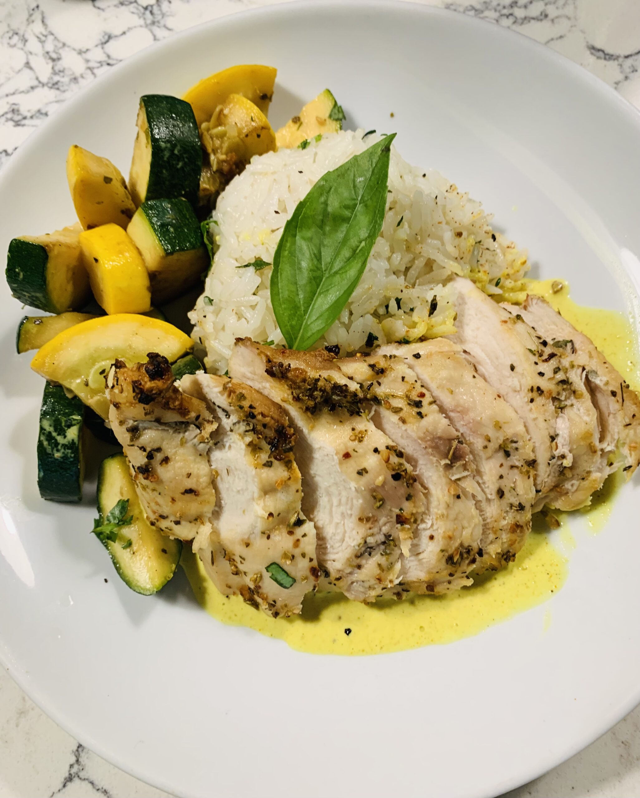 Tender 6 oz roasted chicken breast smothered in creamy coconut curry sauce, paired with zesty cilantro-lime jasmine rice and lightly sautéed zucchini for a fragrant, rich, and balanced flavor experience.