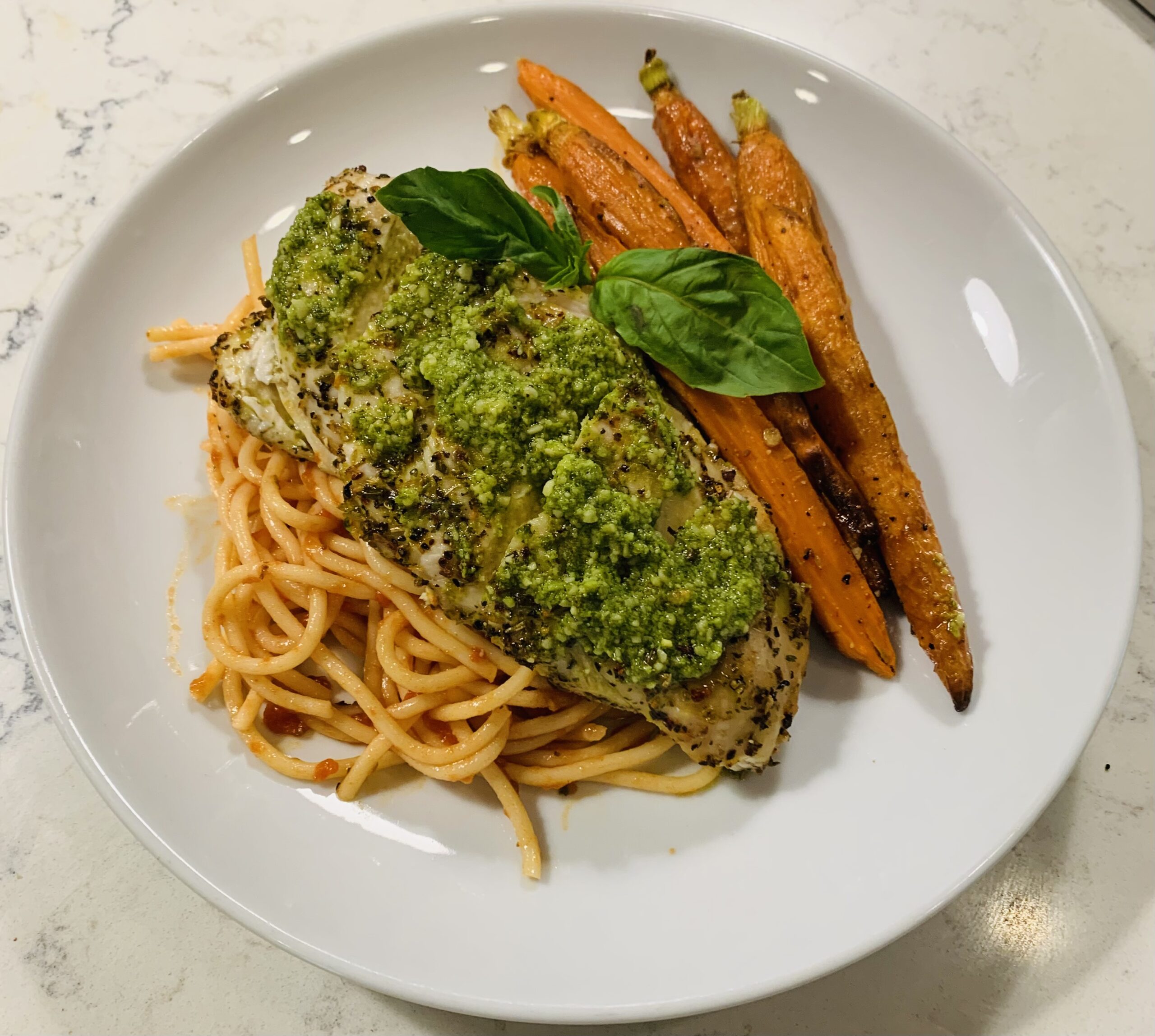 Pasta tossed in a fragrant garlicky basil red sauce, topped with seared chicken breast and basil pesto. Served with tender sautéed baby carrots for a fresh, flavorful finish.
