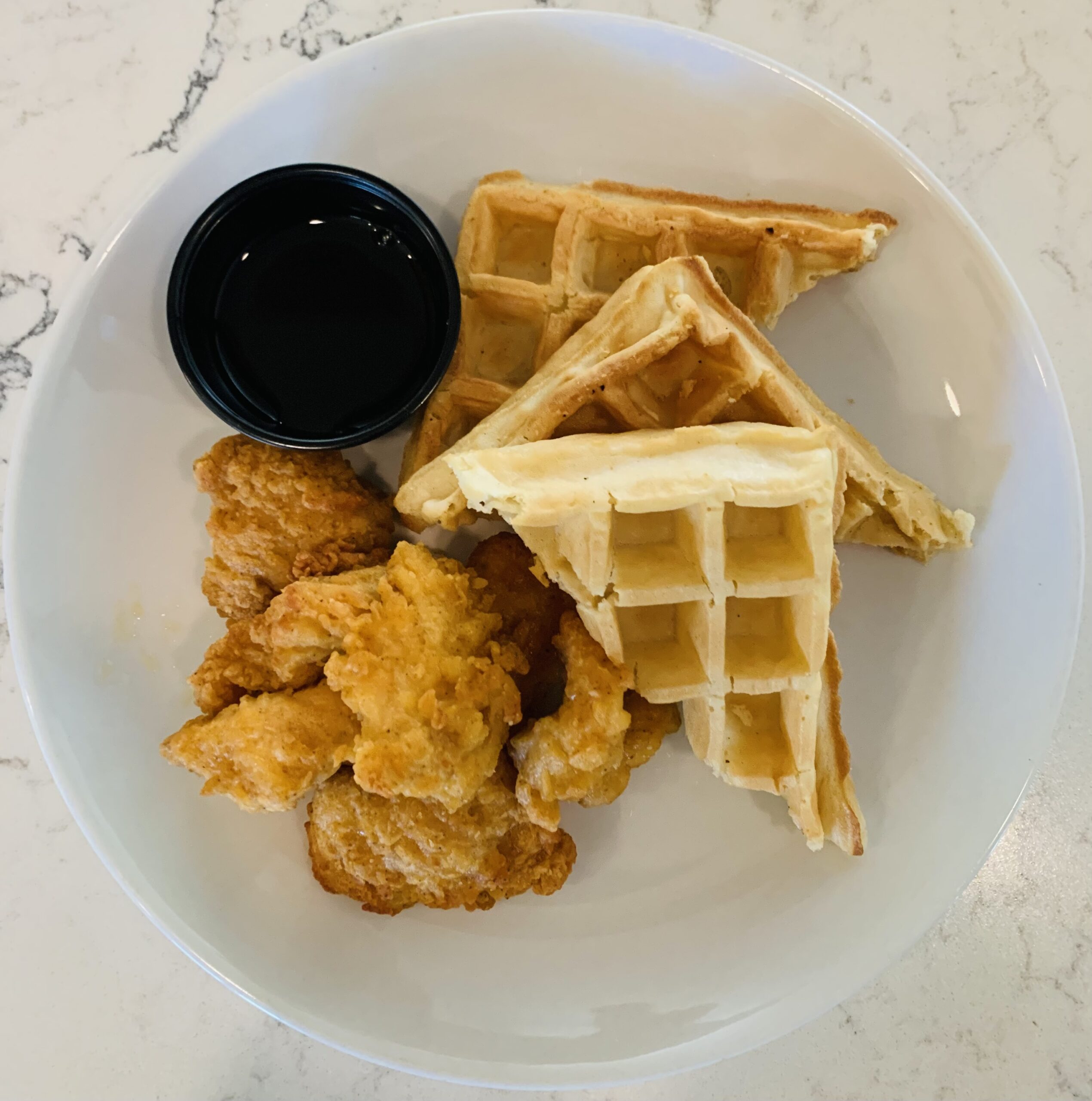 Crispy, lightly breaded chicken baked to golden perfection, paired with Belgian waffles. Served with authentic, rich maple syrup for a perfect balance of savory and sweet in every bite. (Warren’s Favorite!!!)