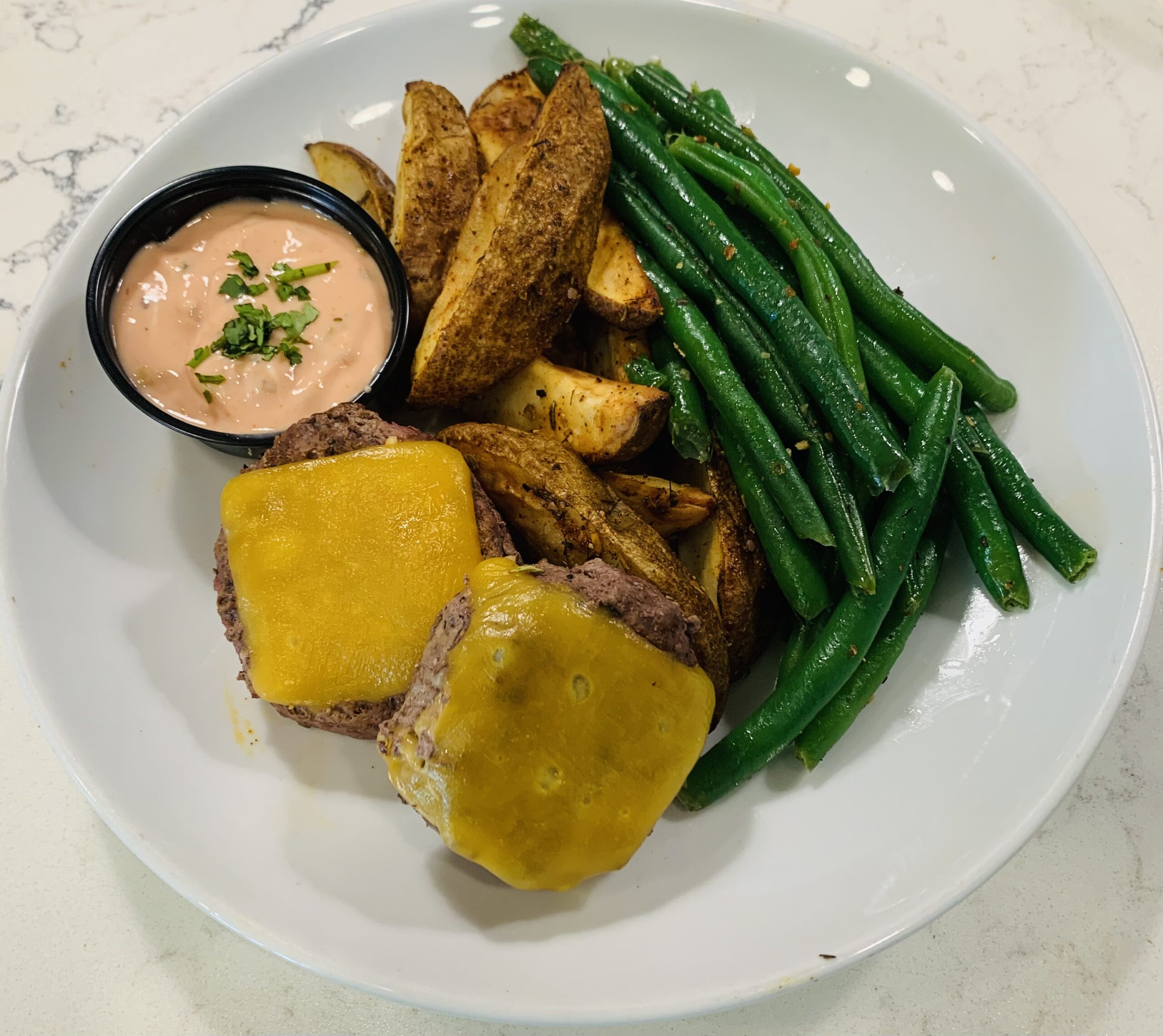 Juicy beef burger topped with melted cheddar cheese, paired with Cajun-seasoned fries and tender sautéed green beans. A perfect blend of bold, savory flavors and fresh sides.