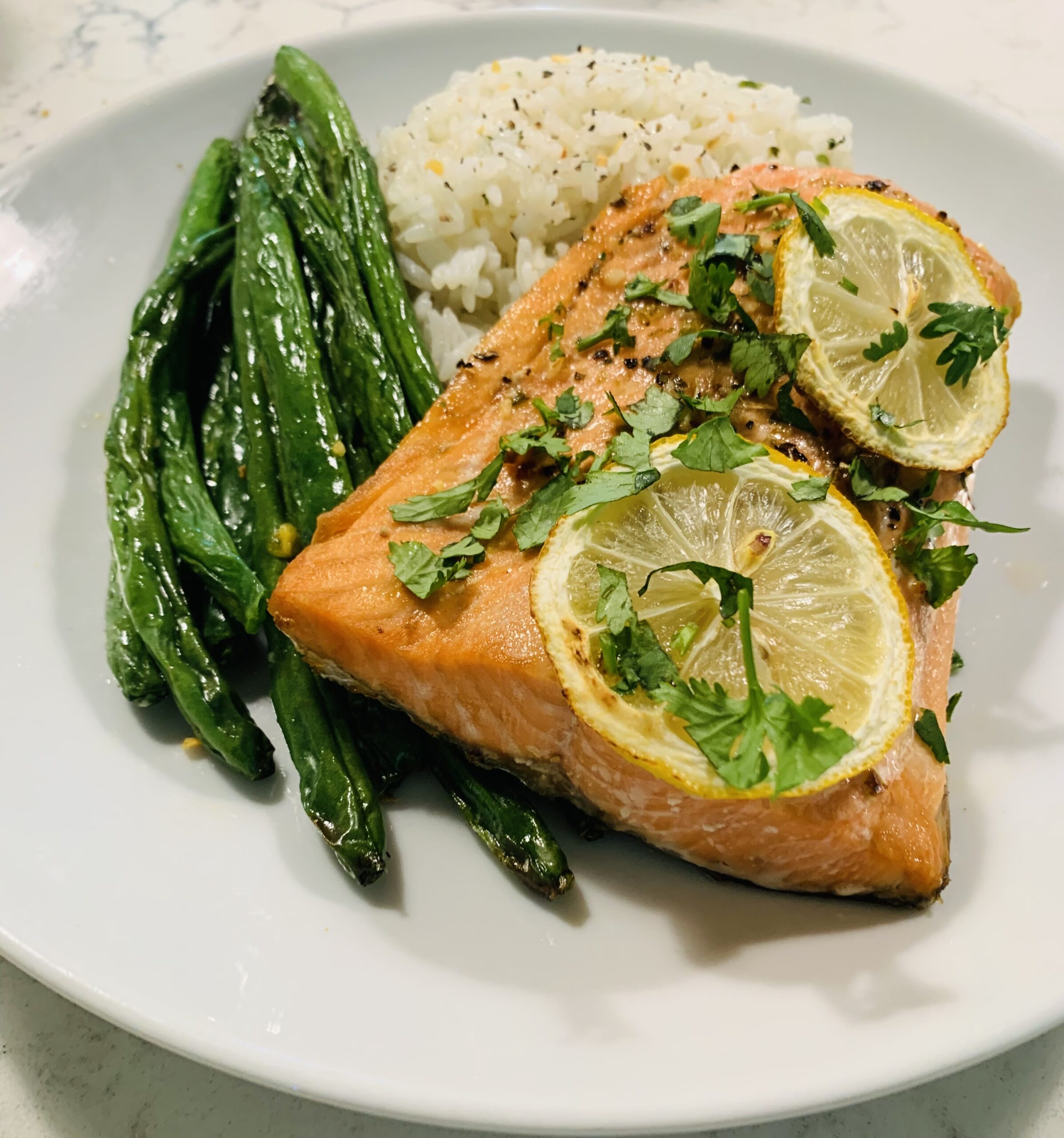 Tender oven roasted Atlantic salmon, crusted with zesty lemon and aromatic herbs. Served atop fragrant jasmine rice with, sautéed green beans for a fresh, balanced meal.
